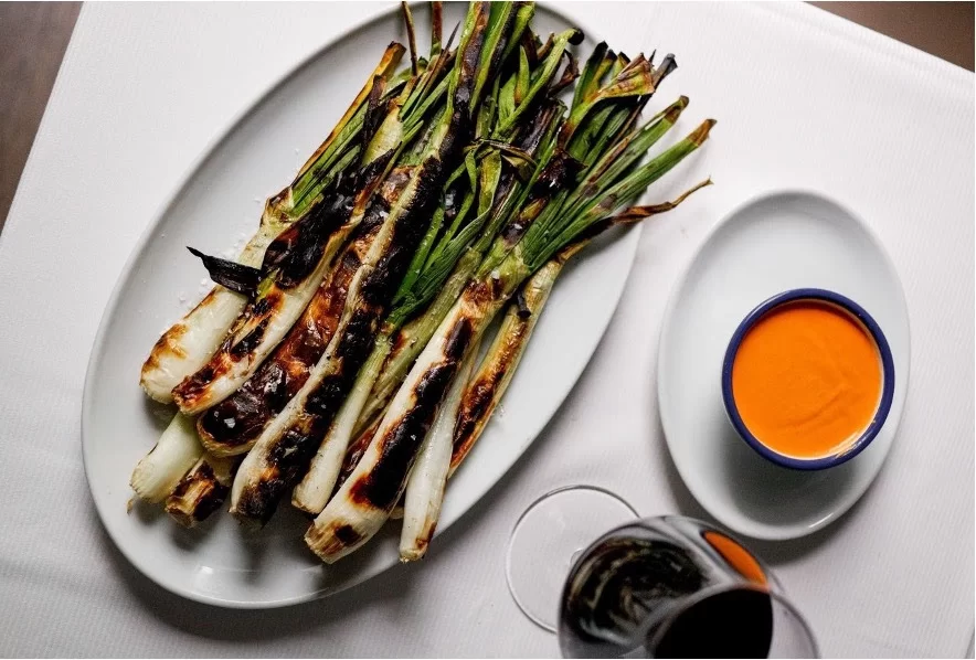 Así, llegan seleccionados directamente desde esa región y se preparan siguiendo el método clásico: cocción sobre parrilla de carbón y llama viva, dejando que el exterior se queme para proteger una pulpa interior sorprendentemente tierna y dulce. El gesto final es imprescindible: sumergirlos en una salsa romesco artesanal, elaborada sin pan, con pimiento rojo asado, frutos secos, ajo y vinagre de Jerez, que realza y equilibra cada bocado.