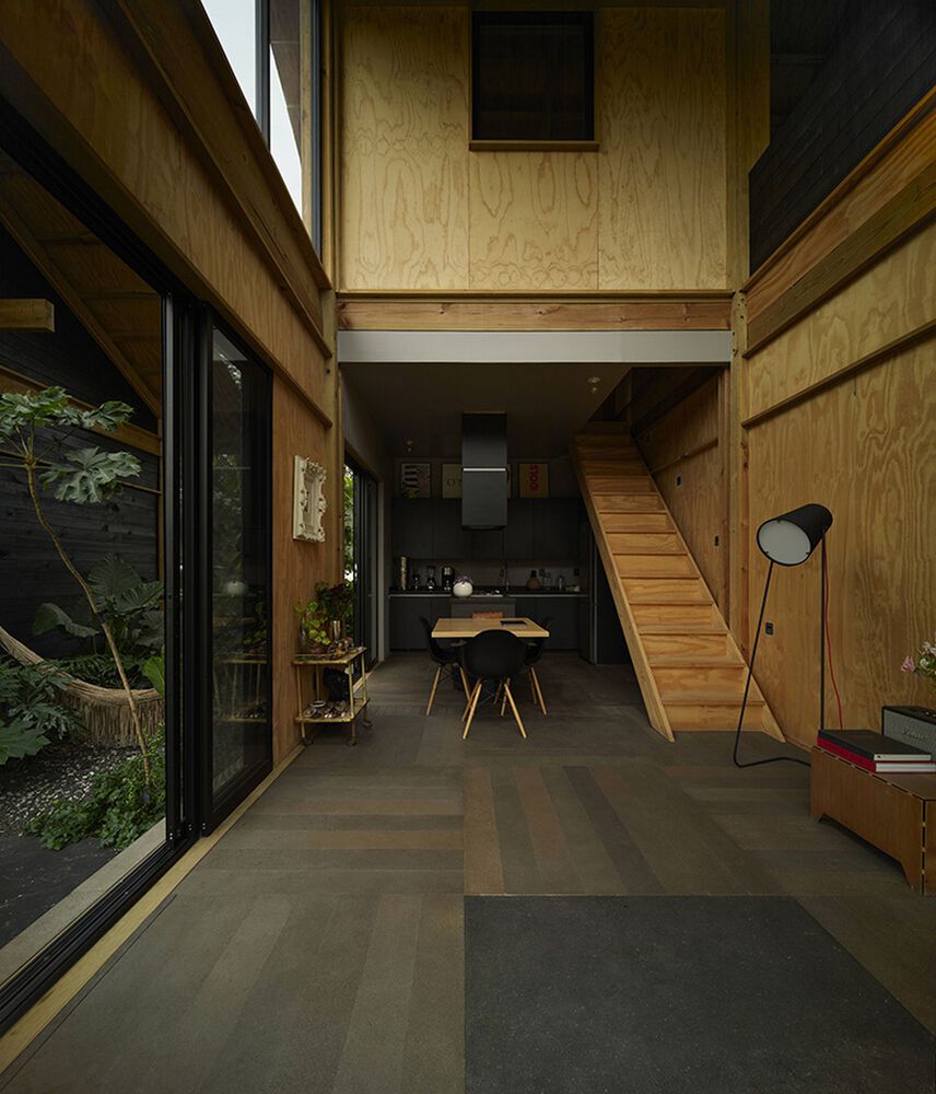 Los acabados interiores incluyen madera contrachapada y papel tapiz, junto con pisos de piedra volcánica negra y terrazo. El exterior está revestido de madera carbonizada, utilizando la antigua técnica japonesa de Shou Sugi Ban. El techo es de madera contrachapada, aislamiento, un material impermeabilizante y tejas de barro negro. La vivienda se construyó en seis meses, según el equipo.