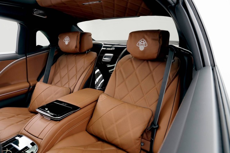 Las llantas forjadas de 5 orificios en MANUFAKTUR olive metallic, complementan el diseño, mientras que el emblema Maybach específico de la edición en el pilar C agrega otro toque de exclusividad: el emblema Maybach se complementa con una medalla cromada y dorada, con un «12» prominente como homenaje al legendario adorno del capó del Maybach Zeppelin DS 8. El anillo en medalla de oro de 24 quilates está adornado con un delicado grabado de diamantes. La incrustación de la medalla, también hecha de oro de 24 quilates, presenta un fino grabado en forma de V, inspirado en la disposición en forma de V de los cilindros de un motor V12.