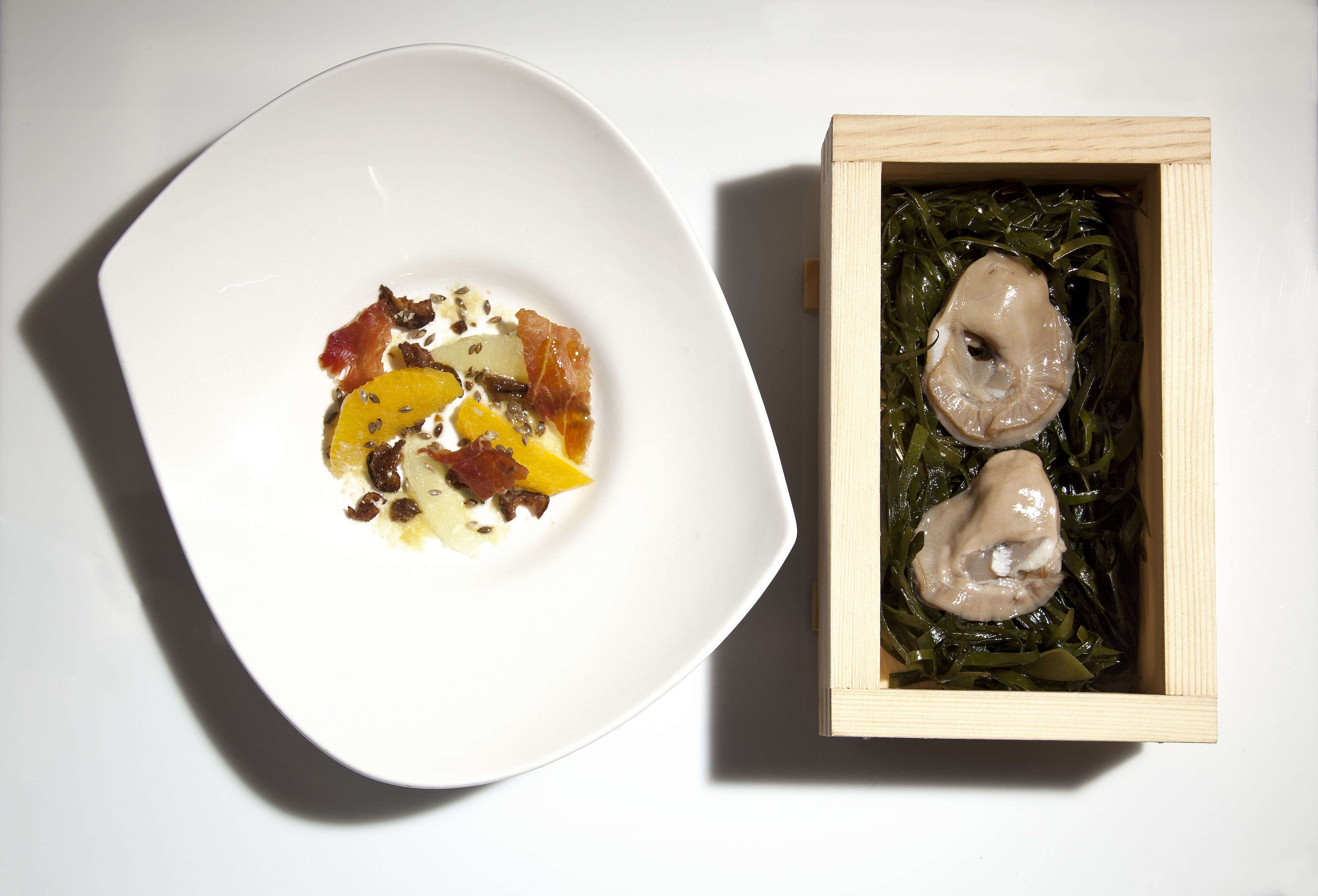 Colocaremos las algas salteadas y sobre ellas las ostras calentadas con el aliño de la vinagreta de trufa. Sobre un plato sopero colocaremos el resto de los ingredientes. Añadir la salsa caliente en el último momento.