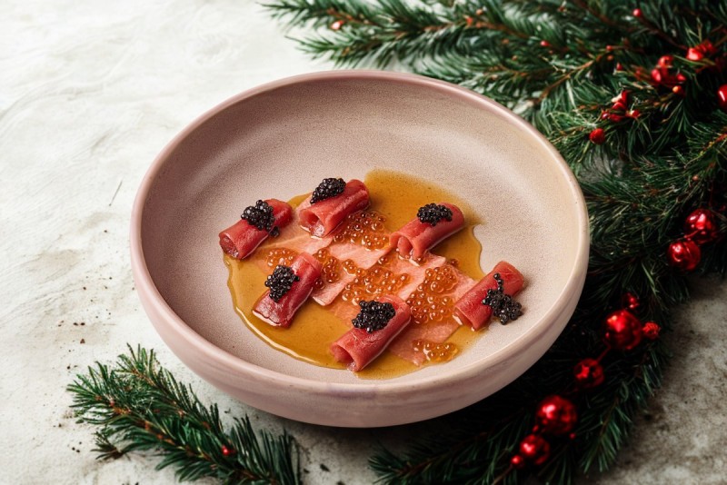 El menú de Nochebuena es un recorrido por sabores oceánicos, con guiños a la cocina japonesa y mediterránea. Platos suaves, equilibrados, con la frescura como punto de partida.